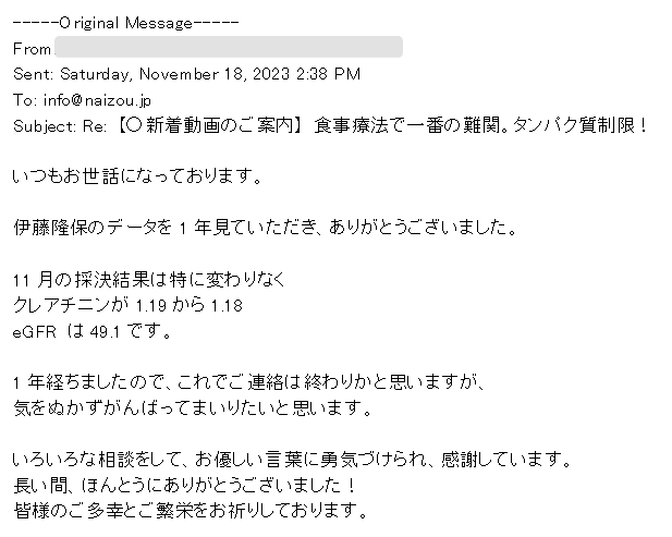 11月の採決結果は特に変わりなくクレアチニンが1.19から1.18eGFR は49.1です。1年経ちましたので、これでご連絡は終わりかと思いますが、気をぬかずがんばってまいりたいと思います。いろいろな相談をして、お優しい言葉に勇気づけられ、感謝しています。