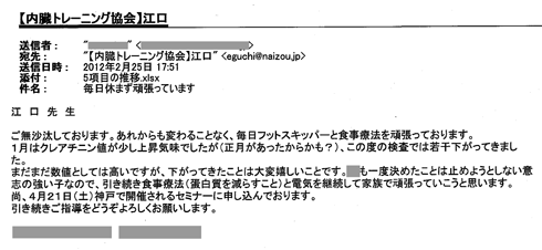(社)内臓トレーニング協会 坂本 浩美様 ご無沙汰しております。 ○○の○○です。 トレーニングの実践状況と検査結果のご報告が二ヶ月ぶりとなり、大変申し訳なく思います。 昨年12月の検査結果をお知らせして以降、年末年始を迎えて食事に不安を覚えていましたが、案の定、1月の検査結果で数値が悪化してしまいました。 気をつけてはいましたが、やはりいろいろと食べ過ぎていたのでしょう。 身体は正直です(笑)。 これまで正常値であった「LDL-コレステロール値」なども上がり、最悪の状態です(詳細は添付の検査結果の通りです)。 食事は最大の課題であることは認識していましたので、2月の検査日までとにかく以前の食生活に戻すことを目標にして生活したところ、Cr.については12月の状態まで戻すことができました。 その他に上昇・下降となかなか数値が安定しませんが、これからも根気強くトレーニングを実施し、食事にも気をつけていきたいと思っています。 Cr. 6.2(12/12)→7.0(1/16)→6.2(2/20) BUN 40(12/12)→55 (1/16)→35 (2/20) UA 5.8(12/12)→7.0(1/16)→6.2(2/20) 「内臓トレーニング」に出会い、実践を始めて1年が過ぎました。 静岡の健康教室に参加したことも、つい昨日の出来事のようです。 なかなか思うような数値にはなっていきませんが、現在も変わらずに日々の生活を送ることが出来ていることには感謝しております。 本当にありがとうございます。 ただ、いつ「その時」がやって来るのかという不安は常につきまとっていますけれど・・・出来ることを確実にこなしていきたいと思っています。 今後ともご指導・ご助言の程、よろしくお願いいたします。 ○市○○