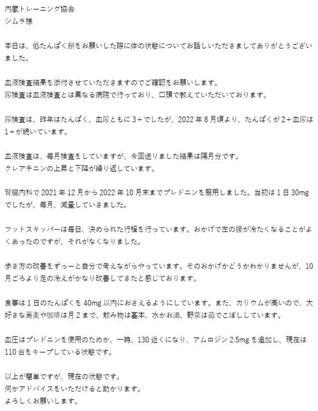 本日は、低たんぱく餅をお願いした際に体の状態についてお話しいただきましてありがとうございました。
