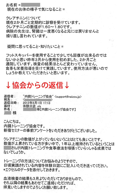クレアチニンについて 現在2か月ごと定期的に診察を受けています。 クレアチニンの数値が1.60~1.80です。 病院の先生は、腎臓は一度悪くなると元には戻りませんと繰り返し言われています。 疑問に思っていること・知りたいこと= フットスキッパーを使用することで少しでも回復が出来るのではないかと思い昨年3月から使用を初めました、2か月ごと通院しています。 検査の結果ほとんど変わっていません、食事も栄養指導を受けて実践しています。 使用方法が悪いのでしょうか教えていただきたいと思います。 ↓協会からの返信↓ ○○様 こんにちは。 内臓トレーニング協会です。 新宿セミナーの事前アンケートをいただきありがとうございました。 クレアチニンの数値が上がっていないということはとても良いことです。 数値が上昇されている方が多い中で、1年以上維持されているということは○○さんが内臓トレーニングや食事療法を頑張っていらっしゃる成果ではないでしょうか。 トレーニングの方法についてお悩みのようですので、日頃実践されている内容を体験日誌にご記入いただき送ってください。 *エクセルのデータを添付しておきます。 血液検査の結果も3月よりいただいておりませんので、それ以降の結果もあわせてご連絡いただければ、拝見いたしますのでよろしくお願い致します。