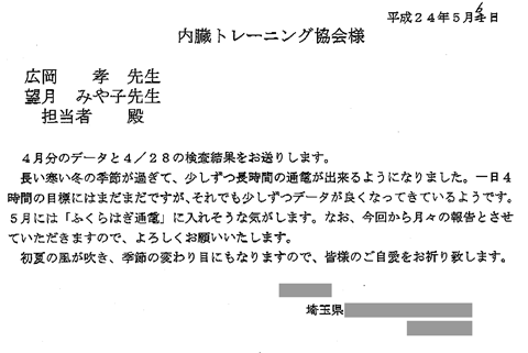 食事のことについてお話します。病院の栄養士さんから、食事の中のタンパク質は1日8グラム、カリウム200ミリグラム、そして塩分は6グラム以内にするよういわれました。それで、私は家の食事では含有量がどのくらいかわからないので、食品取引会社の本の中から、腎臓食を1か月分取り寄せて、週のうち2度くらい、魚と肉を交互にスーパー等で購入しています。このときは、塩分はごく薄味にして食し、栄養士さんのご忠告を忠実に守っています。 それでも数値が少しずつ高くなってくるので、途方に暮れていたとき内臓トレーニングのことを○○さんから聞き、おぼれるもの藁をもつかむの気持ちで(内臓トレーニングに取り組みました)。 5月1日に血液検査をしたら、クレアチニン、尿素窒素、尿酸がすこしさがっていました。 まだ20日ばかりで、効果が出たのかと驚いています。 そのことを先ず報告します。そして、血液の検査結果と食事のことをファックスします。 坂本様 協会からの返信 内臓トレーニングの坂本です。 FAXを付けていただいたんですね。ありがとうございます。 検査表を拝見いたしました。クレアチニン値が下がってよかったですね。 食事療法の成果で尿素窒素が下がっていますので、少しずつでも下がってくるように調整していきましょう。 尿酸値が少し高めなので、水分をこまめにとって尿量が増えるようにしてみましょう。 カリウムは、野菜や果物に多く含まれます。腎臓病食以外に生野菜や果物を取られているようでしたら、量を調整してみましょう。 血液検査の結果は、○○さんの自己管理の成績表になりますので、今後も経過を見ながら、○○さんにあった方法を作っていきましょう また、内臓トレーニングの実践や、ご不明な点がありましたら、いつでもご連絡ください。