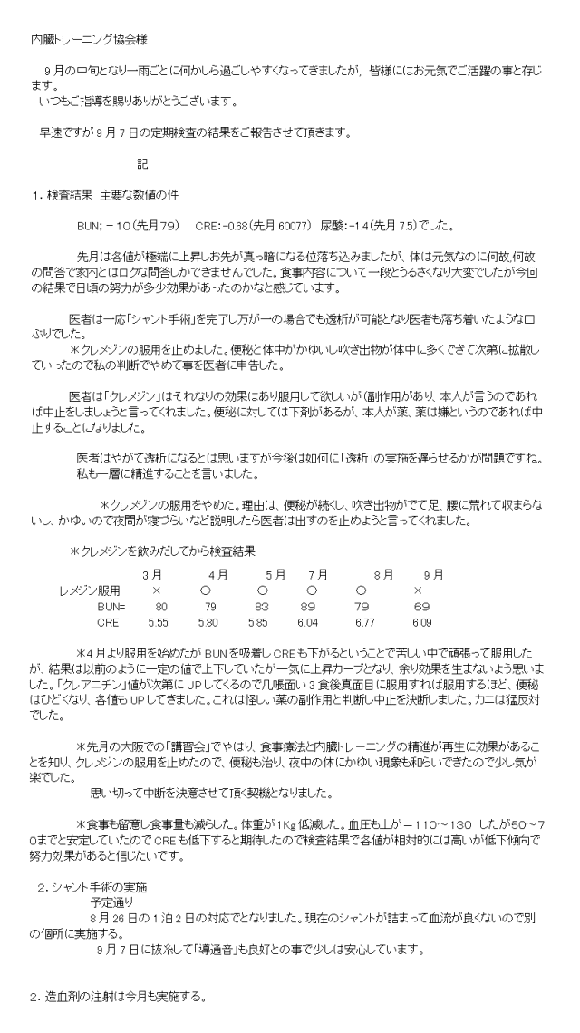 クレアチニンは2.45(7/15)⇒1.72(8/19)⇒1.26(9/23)と改善されました。