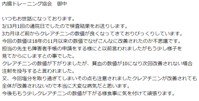 今後ももう少しクレアチニンの数値が下がる様食事に気を付けて頑張ります。