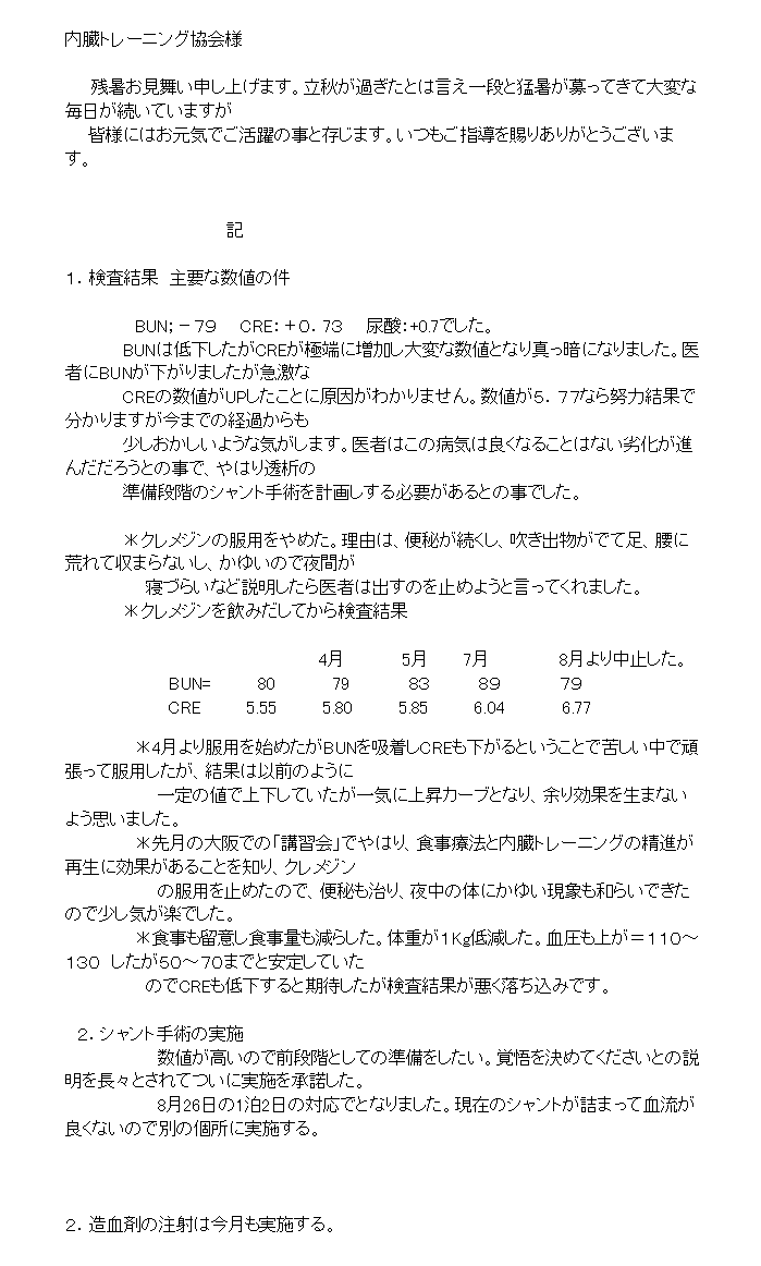 *先月の大阪での「講習会」でやはり、食事療法と内臓トレーニングの精進が再生に効果があることを知り、クレメジンの服用を止めたので、便秘も治り、夜中の体にかゆい現象も和らいできたので少し気が楽でした。