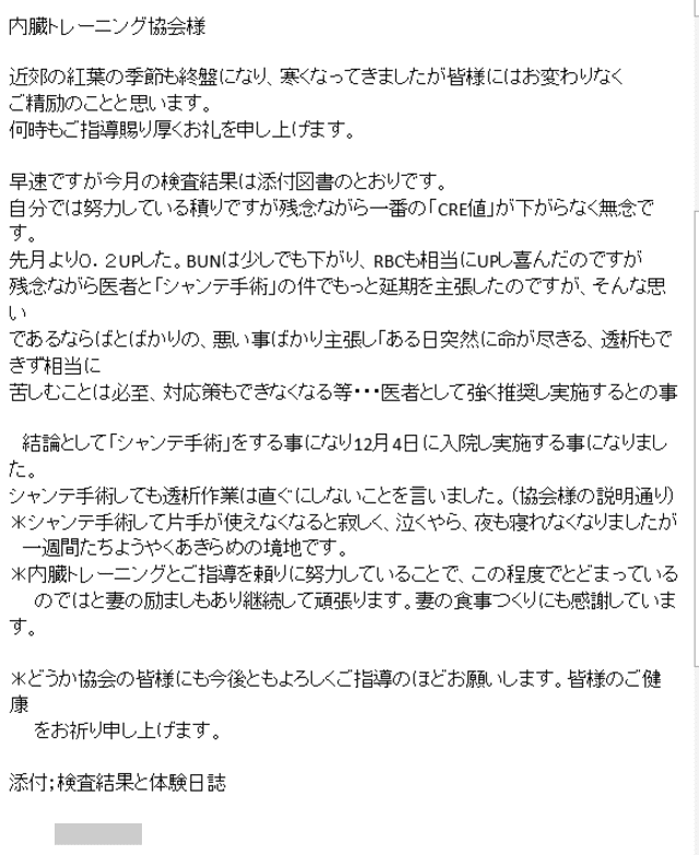 トレーニングを始めて2年8ヶ月、この間、自分なりに努力をしてきましたが、昨年、夏頃よりクレアチニンや尿素窒素等の悪化が速くなり、12月に限界となりました。