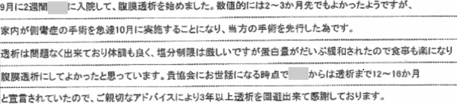 透析は問題なく出来ており体調も良く、塩分制限は厳しいですが蛋白量がだいぶ緩和されたので食事も楽になり腹膜透析にしてよかったと思っています。