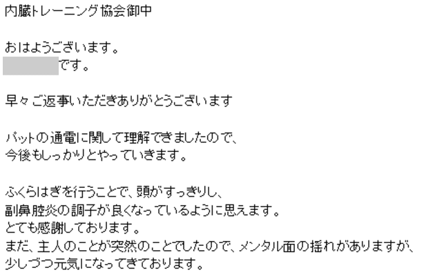 基準値ギリギリの状態で協会にお世話になれて感謝×1,000です。早いうちにお世話になると好きな食べ物も自由に食べられるって事が実感出来てます。改善出来ているように感じることは・起床後すぐの血圧が安定(75前後~125前後)・夜中2~3回ほどトイレに起きるのにも熟睡出来る、そのとき湯飲み茶わんに一杯の水を飲む・以前は不整脈がかなり多かったのが今はほとんどゼロ、起床後すぐの脈拍は61前後で安定。・以前は真夏でも足が冷たかったのが無くなってる。今年の冬はどうなるのか楽しみです。・まるっきち改善出来ていないのは、静岡にお邪魔したときはスキンヘッドでした。スキッパーⅡで少しは毛がはえてくると期待していましたが、全然ダメでした(これは冗談です)