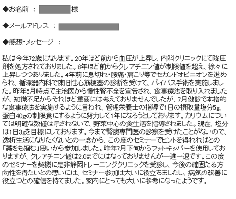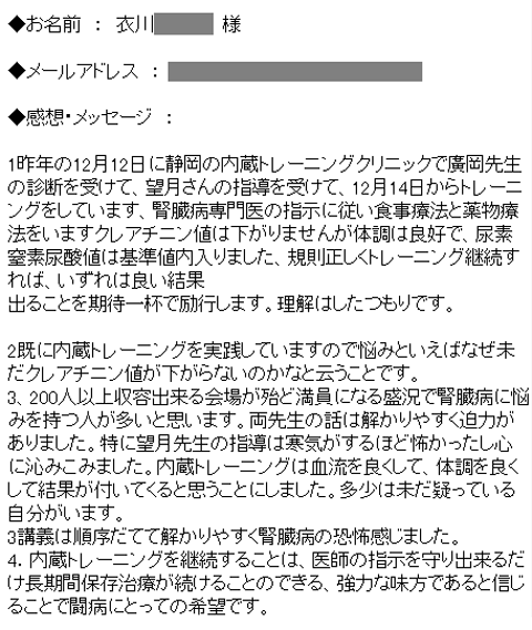 1, 昨年の12月12日に静岡の内蔵トレーニングクリニックで廣岡先生の診断を受けて、望月さんの指導を受けて、12月14日からトレーニングをしています、腎臓病専門医の指示に従い食事療法と薬物療法をいますクレアチニン値は下がりませんが体調は良好で、尿素窒素尿酸値は基準値内入りました、規則正しくトレーニング継続すれば、いずれは良い結果出ることを期待一杯で励行します。