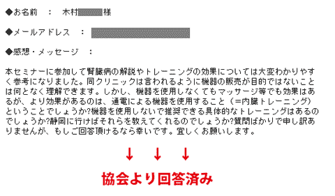 3, 200人以上収容出来る会場が殆ど満員になる盛況で腎臓病に悩みを持つ人が多いと思います。両先生の話は解かりやすく迫力がありました。特に望月先生の指導は寒気がするほど怖かったし心に沁みこみました。内蔵トレーニングは血流を良くして、体調を良くして結果が付いてくると思うことにしました。多少は未だ疑っている自分がいます。