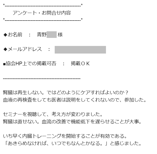 大変心に響き、数年前は血液のデーターをそこまで悪くなっていなく、毎回主治医からまだ腎臓も悪くなっていないので、頑張っていきましょうと言われていました。