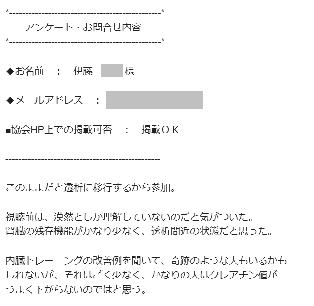 10年ほど前から血液検査において腎機能の低下が見られ、48歳を前にしてクレアチニン1.8、eGFR33と悪い状態となってきたので、何かしないと、、と思い参加しました。
