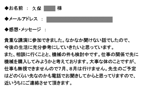 なかなか聞けない話でしたので、今後の生活に充分参考にしていきたいと思っています。