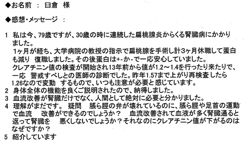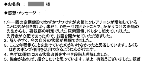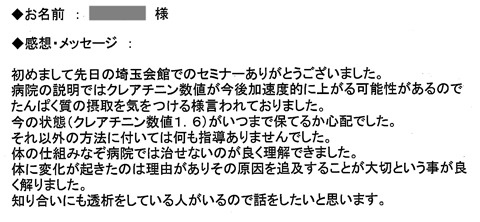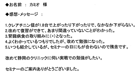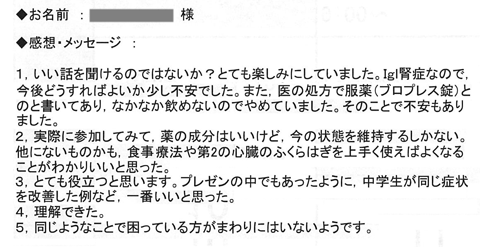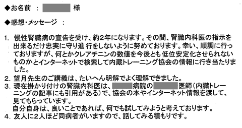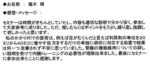 私のかかりつけの医者は、例えば足がむくんだといえば利尿剤の単位を20ミリから40ミリに増やす処方をするだけの単独に症状に対応する処置で結果は何一つ改善されず不安に思っていました。腎臓の機能維持についての詳しい説明を受けて内臓トレーニングの必要性が理解できました。最後にセミナーに参加できたことに感謝します。