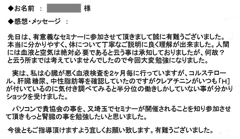 パソコンで貴協会のことを又埼玉でセミナーが開催されることを知り、参加させて頂きもっと腎臓のことを勉強したいと思いました。