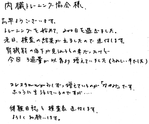 内臓トレーニング協会様 お早うございます。 トレーニングを始めて、200日を過ぎました。 先日、検査の結果が出ましたので送付します。 腎機能の低下が見られるとの事だったけど今回ろ過量が以前より増えていました(うれしい事でした) コレステロールが少しずつ増えているのが「なやみ」です。 ふつうに生活しているのですが・・・・ 体験日誌と検査表送付します。 よろしくお願いします。