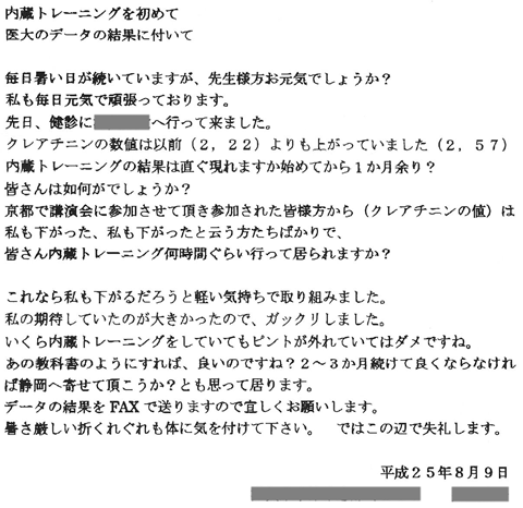 内臓トレーニング協会 福井さま 残暑お見舞い申し上げます。 まだまだ暑い日が続くと思われますがご奮闘を期待しております。 さて、検査記録の報告が遅れておりますのでFAXにておおくりいたします。 全体的にクレアチニン値が7月4日より悪くなりましたが本日(8月21日)の検査で少し改善されました。 尿酸値にも改善が見られました。 なお、内臓トレーニングは、この1ヶ月間ほぼ毎日各部所を1時間くらいおこなっています。 医師からは、心臓に水がたまっているとのことで2週間おきに検査を行っていましたが、今回は3週間後に診察することになりました。 なお、シャントは念のために8月14日に手術を行いました。 ○○
