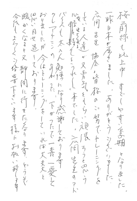 桜前線も北上中。 すごしやすい季節となりました。 一昨日、本が届きました。 ありがとうございました。 廣岡先生、協会の皆様のご努でトレーニングをしている人達が又勇気をもらい頑張ろうと思う心を持たせてくれる嬉しい本でした。 廣岡先生のアドバイスも大変勉強になり感謝しております。 クレアチニンの値が上がった下がったで一喜一憂しておりましたが今はトレーニングをしていれば大丈夫と思い日々過ごしております。 暖かくなると又静岡に行きたくなります。 どうぞ今後もよろしくご指導下さいます様にお願い致します。