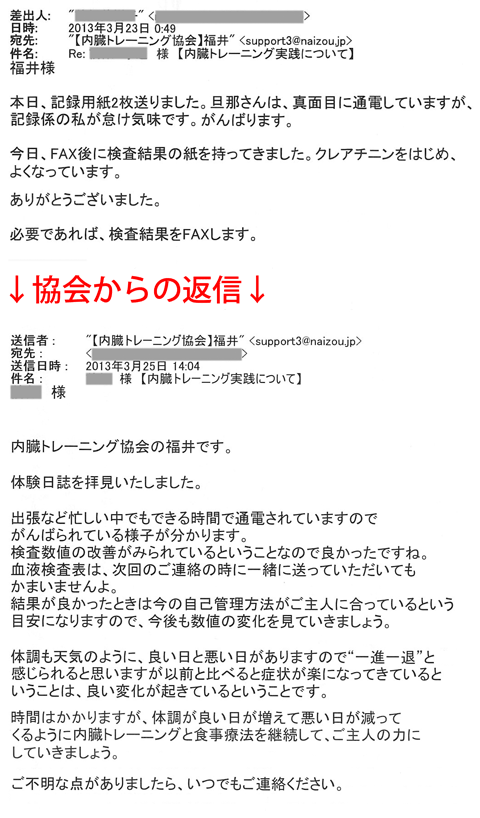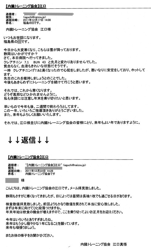 内臓トレーニング協会 江口様 いつもお世話になります。 福島県の○○です。 今日から大変寒くなり、こちらは雪が降っております。 静岡はいかがですか? さて、本日病院へ行ってきました。 クレアチニン7.1 BUN43 と先月と変わりありませんでした。 貧血もなく、血液もきれいな状態だそうです。 一時 クレアチニンが7.8と高くなったので心配をしましたが、悪いなりに安定しており、ホットしています。 先生のこれを維持しましょうとのことでした。 今後もあきらめずにトレーニングを続けて行こうと思います。 それでは、これから寒くなります。 どうぞ風邪などひかれませんように。 私も体調には注意し年末を乗り切りたいと思います。 早いもので今年も後、二週間で終わろうとしています。 この一年、いろいろご指導頂きありがとうございました。 また、来年もよろしくお願いいたします。 それでは、江口様並びに内臓トレーニング協会の皆様にとり、来年もよい年でありますように。 ↓↓協会からの返信↓↓ こんにちは、内臓トレーニング協会の江口です。 メール拝見致しました。 静岡もさすがに寒くなってきましたが、日によっては昼間は長袖1枚でも過ごせる日があります。 検査数値拝見致しました。 前回よりもかなり数値を戻されて本当に安心致しました。 まずは年末に向けてひと段落つけます。 年末年始は飲食の機会は増えますので、ここを乗り切ってよいお正月をお迎えください。 今年はいろいろとありすぎましたね。 来年はもう少し穏やかな1年になることを願っています。 来年も頑張りましょう。 またお体の様子をお聞かせください。