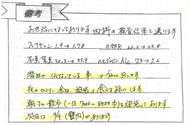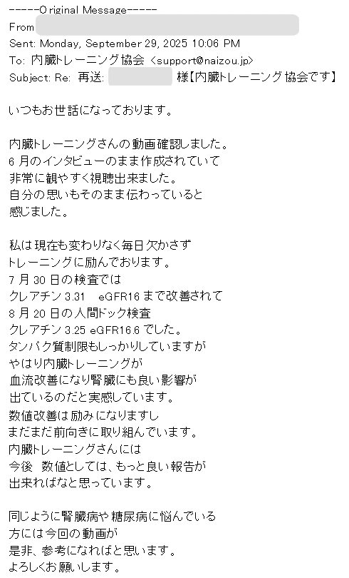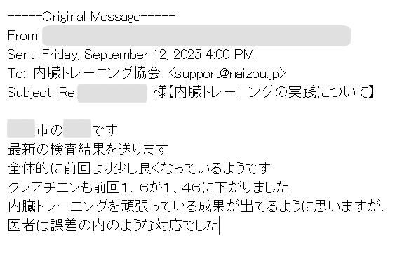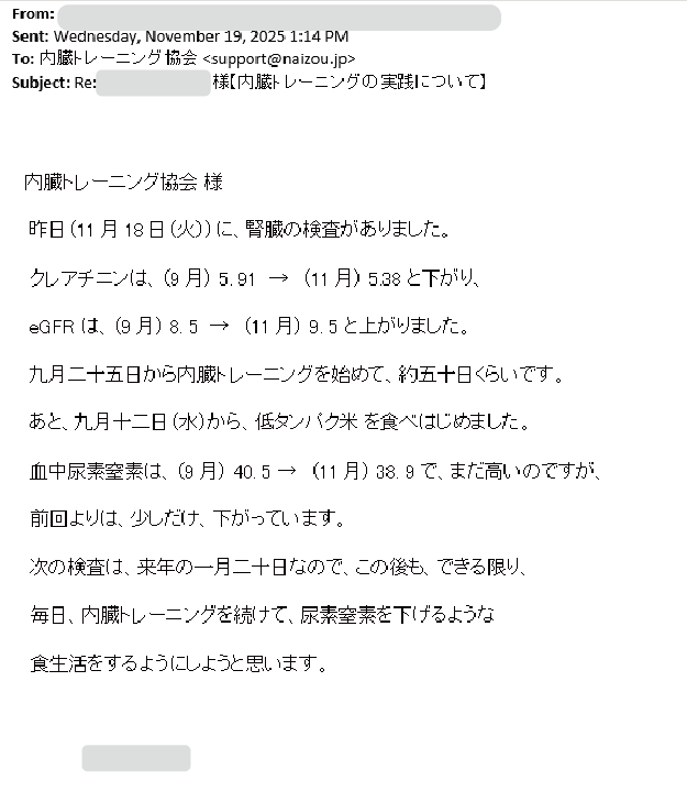 日々の内臓トレーニングや食事制限によって、腎機能の数値は改善してきております。