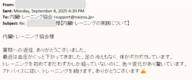 足の冷えもなく、体がポカポカしています。トレーニングを初めてまだわずかしか経っていないのに、色々変化があり驚いています。