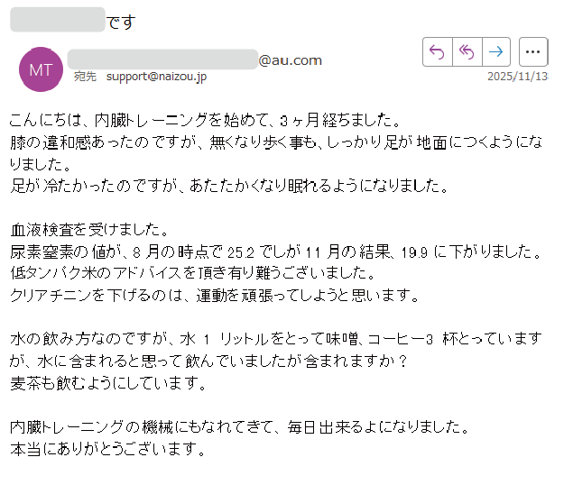 内臓トレーニングが血流改善になり腎臓にも良い影響が出ているのだと実感しています。