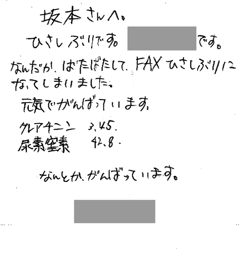 検査表のクレアチニンの数値に一番先に目が行きます。今回はクレアチニン値が少し下がっていました。その他の数値も現状維持で安心しました。ただ、採血する前に脱力したようにぐったりしてしまいましたので、採血した直後に甘いものを飲んだら少し良くなりました。