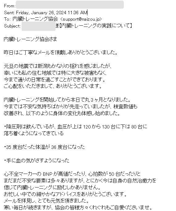 ご心配をいただきまして、ありがとうございます。内臓トレーニングを開始してから本日で丸3ヶ月となりました。今までは不安な気持ちばかりが先走っていましたが、検査数値も