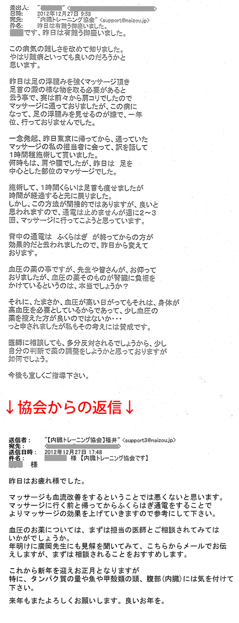 明けましておめでとうございます。 本年も宜しくご指導の程お願い申し上げます。 トレーニングの方は2サイクルを終了いたしましたのでご報告いたします。 体の方の変化は残念ながらなく、腰痛も変化を見出せず(ご指導に従い温パックを使用) 副作用も全くありません。 一つ変化があったのは、長らく頻尿で悩まされておりましたが、いつのまにか夜間の排尿回数が5回から2回に減少して熟睡できるようになったことです。 因果関係はわかりませんが、トレーニングのお蔭と思っています。 取敢えずは腰痛が少しでも楽になるよう頑張ってまいりたいと思います。 糖尿病主治医の方の血液検査は今まで半年に1度しかしなかったので次回1月11日に検査を依頼いたします。 結果はメールでご報告いたします。 血圧は起床時就寝時とも130/75以下で安定しておりますが糖尿病主治医よりの指示でロサルタンK錠25mgを朝1錠服用を継続しております。 お気付きの事があれば、ご指導の程お願いいたします。