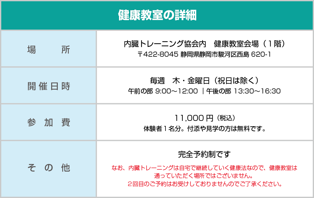 「一般社団法人 内臓トレーニング協会」では、個人情報の収集、管理等には万全を期しておりますが、この件に関する会員の損害、補償は一切を免責とします。