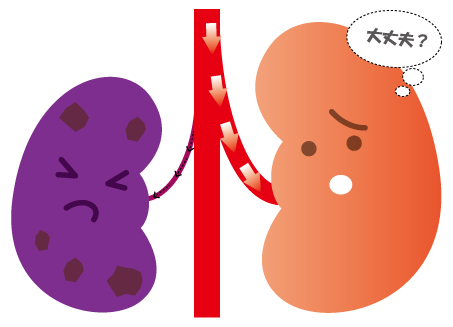 腎臓に繋がっている血管の太さが全然違います。血液は酸素と栄養を各細胞に送り、細胞が元気に働くようにしています。しかし、この写真の腎臓に繋がっている左側の細々とした血管では、血液が腎臓まで十分な量が届きません。そのため、細胞が働けず死んでいき、腎臓は萎縮していきます。