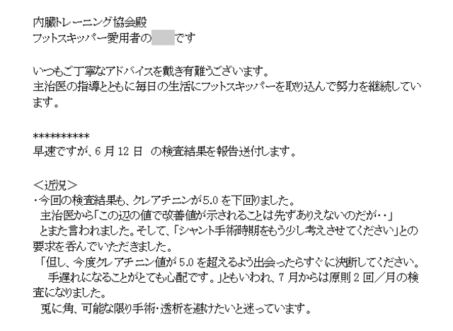 ・今回の検査結果も、クレアチニンが5.0を下回りました。