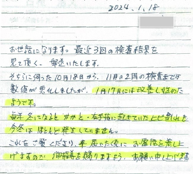 最近3回の検査結果を見ていただきたく、郵送いたします。そちらに伺った10月18日から11月の2回の検査までは数値が悪化しましたが、1月17日には改善しはじめたようです。